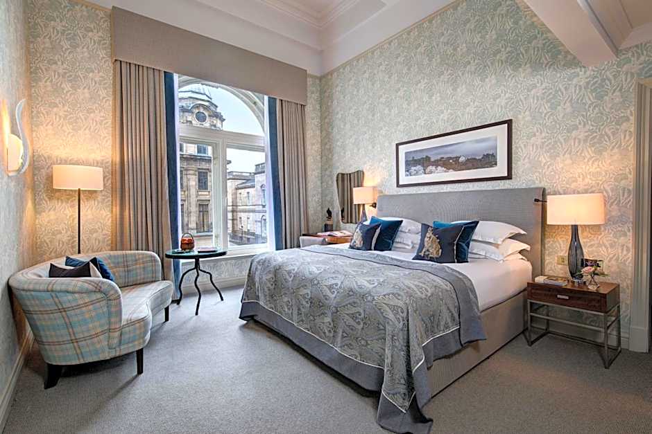 The spacious deluxe rooms feature a king-size bed and views of Edinburgh or the hotel's internal courtyard.