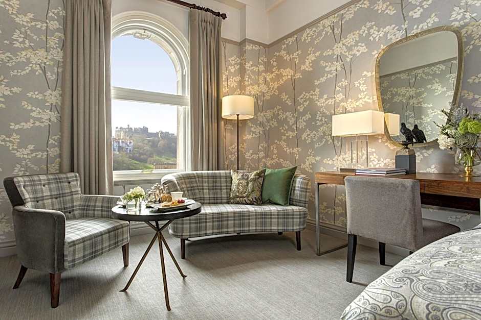 The junior suites feature a lounge area in the room and views of Edinburgh or the hotel's internal courtyard.